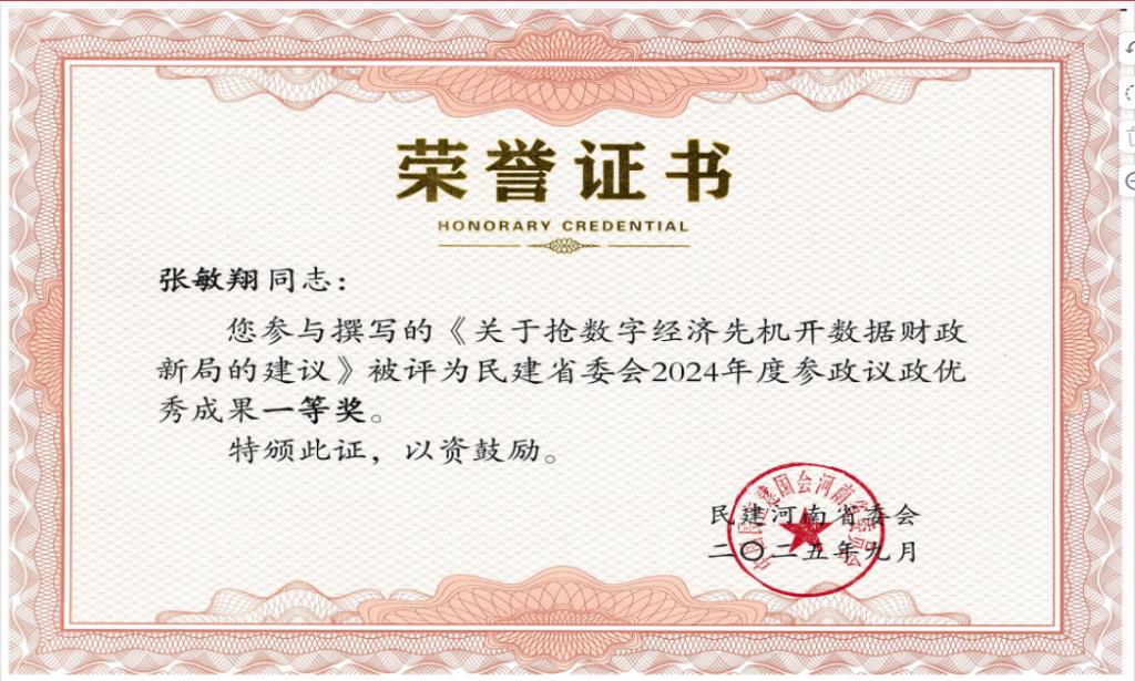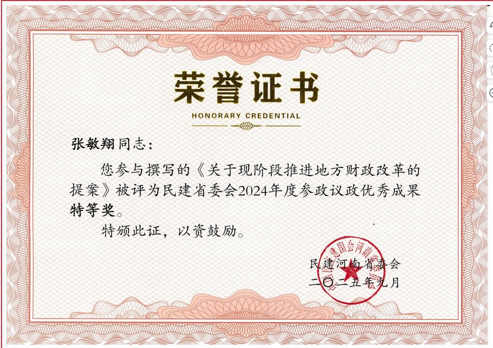 近日,中国民主建国会河南省委员会公布了2024年度参政议政优秀成果评选结果。民建省直综合十九支部主委、民建省财政金融委员会副主任、我校财政税务学院张敏翔副教授参与撰写的两份建言材料《关于现阶段推进地方财政改革的提案》和《关于抢数字经济先机开数据财政新局的建议》,分别荣获参政议政优秀成果特等奖、一等奖,充分展现了我校党外知识分子在服务国家战略、推动区域经济社会发展中的责任担当与专业智慧。