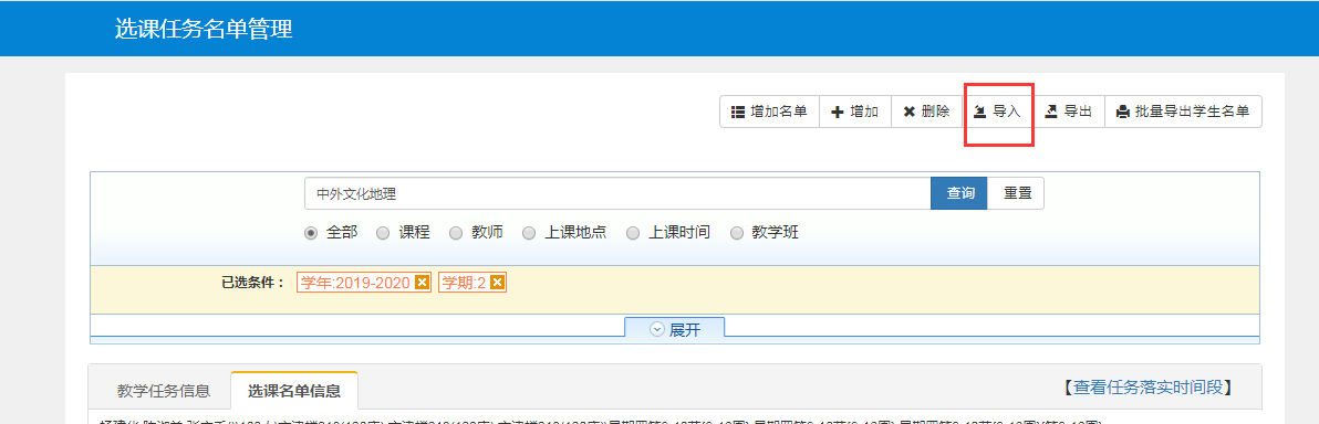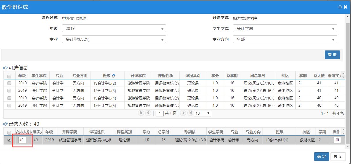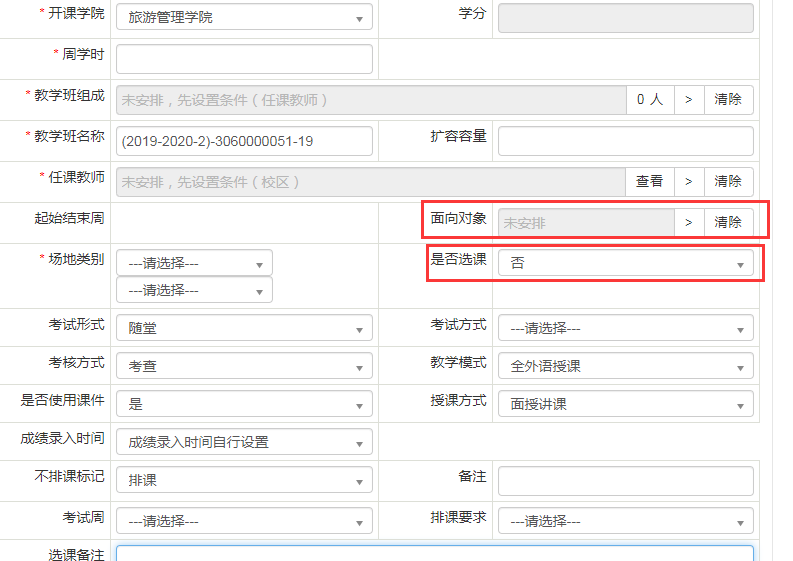 需要学生选课的专业选修课程在安排教学任务时,合班个数需多加考虑。因为先排课后选课(所有学分版本科院校皆如此),选课人数达不到15人的课程被砍掉,会出现老师排好课程不开课的情况。上学期先排课,再让学生选完课,最后安排了调课工作,在系统上的调课工序非常麻烦还容易出错;本学期先排课,让老师调完课后,再安排学生选课,选课人数达不到要求的课程被砍掉,选完课原则上不再给与调课机会。